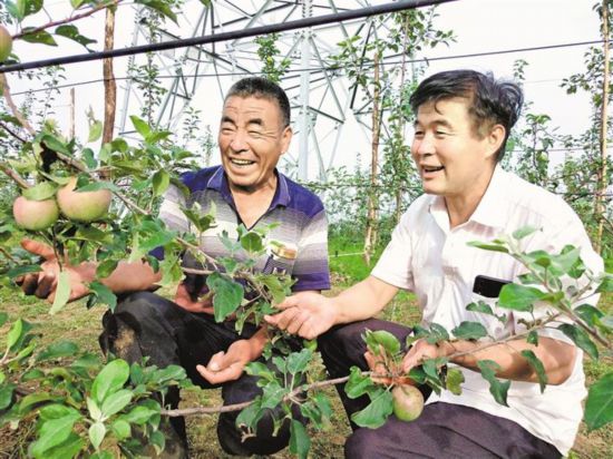 看著自家地里的蘋果長勢旺盛,楊天軍(左一)按捺不住心中的喜悅。本報記者 高山攝