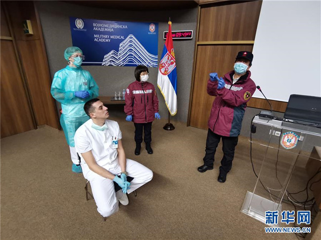 3月28日,中國赴塞爾維亞抗疫醫(yī)療專家組在貝爾格萊德對醫(yī)護人員進(jìn)行培訓(xùn)時講解標(biāo)本采集。 新華社發(fā)(專家組供圖)