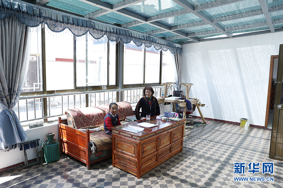 白瑪和她的媽媽坐在客廳里。新華網(wǎng)記者焦鵬 攝