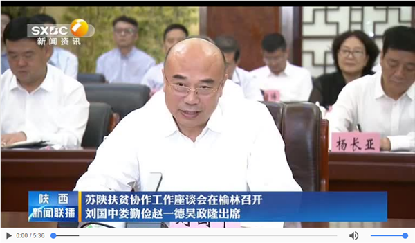 省委書記劉國中主持會議并講話,江蘇省委書記婁勤儉講話。省長趙一德、江蘇省省長吳政隆分別介紹兩省經(jīng)濟社會發(fā)展和蘇陜扶貧協(xié)作情況。省委常委張廣智、王浩、盧建軍,省人大常委會副主任劉小燕、郭青、戴征社,副省長魏增軍、徐啟方,江蘇省委常委張敬華、藍紹敏、郭元強出席會議或參加相關活動。
