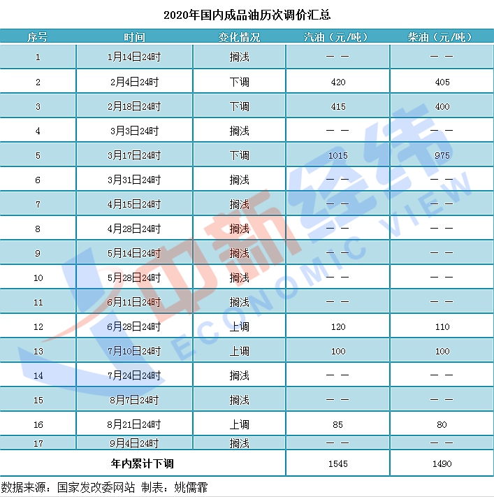 據(jù)中新經(jīng)緯客戶端統(tǒng)計(jì),2020年以來國內(nèi)成品油調(diào)價(jià)已進(jìn)行了十七輪,具體為上調(diào)三次、下調(diào)三次,擱淺十一次,汽油總計(jì)下調(diào)了1545元/噸,柴油總計(jì)下調(diào)了1490元/噸。其中,3月31日至6月11日的6輪調(diào)整均因國際市場原油價(jià)格低于40美元/桶而擱淺。如果本輪成品油調(diào)價(jià)下調(diào),2020年國內(nèi)成品油調(diào)價(jià)將呈現(xiàn)“三漲四跌十一擱淺”的格局。