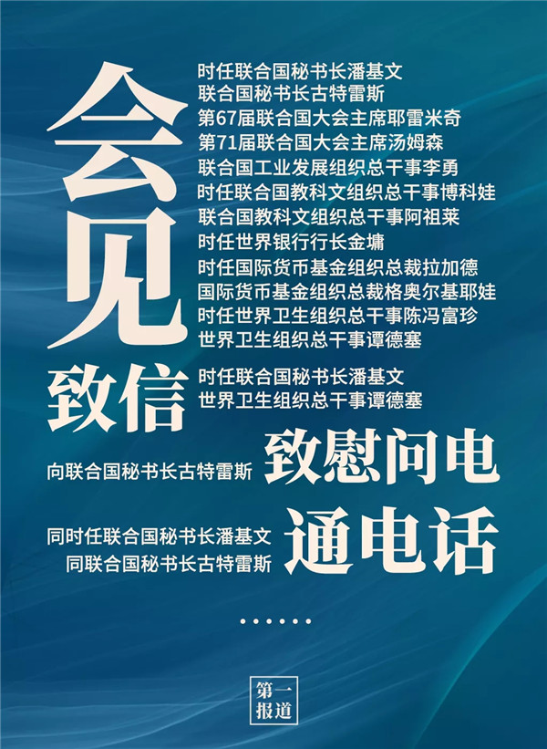 2013年以來,習(xí)主席通過會見、通話、致信函等多種方式同聯(lián)合國主要官員保持密切溝通。互動(dòng)對象包括聯(lián)合國秘書長、聯(lián)合國大會主席,還有聯(lián)合國工業(yè)發(fā)展組織、聯(lián)合國教科文組織、世界銀行、國際貨幣基金組織、世界衛(wèi)生組織等聯(lián)合國專門機(jī)構(gòu)主要負(fù)責(zé)人。
