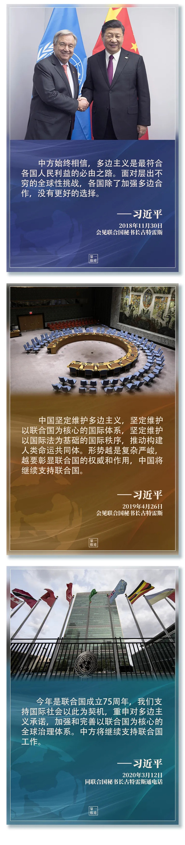 習(xí)主席指出,“支持聯(lián)合國發(fā)揮作用,維護(hù)聯(lián)合國權(quán)威和地位,是中國外交一項(xiàng)基本政策。”2013年以來,習(xí)主席多次會見聯(lián)合國主要官員,訪問聯(lián)合國總部及聯(lián)合國專門機(jī)構(gòu),出席一系列聯(lián)合國活動(dòng)……親自推動(dòng)中國同聯(lián)合國的合作,發(fā)出支持聯(lián)合國事業(yè)、捍衛(wèi)多邊主義的中國強(qiáng)音。