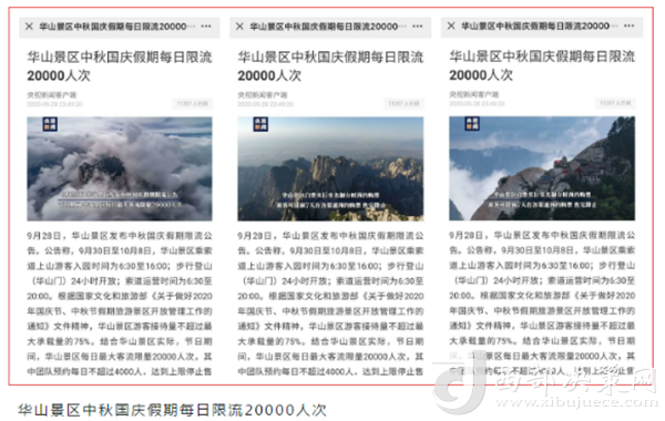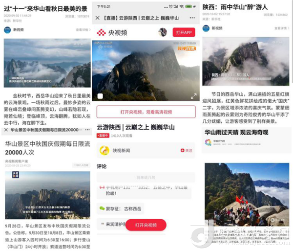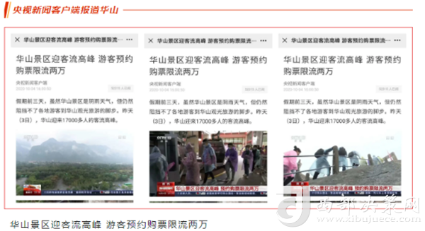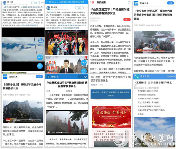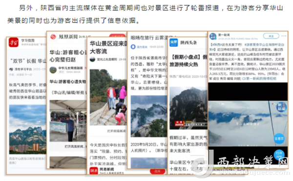 度節(jié)期間,通過央視cctv2【天下財經(jīng)】、cctv4、cctv13【新聞30分】、cctv13【新聞直播間】、央視網(wǎng)【國慶假期·出游】、央視網(wǎng)學(xué)習(xí)強國、央視新聞客戶端、新華社等國家級媒體對景區(qū)度節(jié)工作、游覽秩序、特色服務(wù)等方面進行轟炸式報道;聯(lián)合陜西日報、陜西電視臺、渭南日報、渭南電視臺、三秦都市報、陜西旅游資訊、騰訊網(wǎng)、新浪網(wǎng)、網(wǎng)易陜西、鳳凰陜西等30余家主流媒體對景區(qū)度節(jié)期間各項工作及實時風(fēng)景進行跟蹤報道,共計發(fā)布各類宣傳稿件239篇,全面提升景區(qū)旅游熱度。