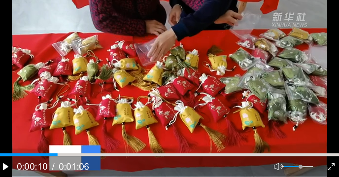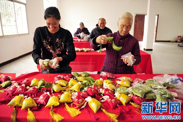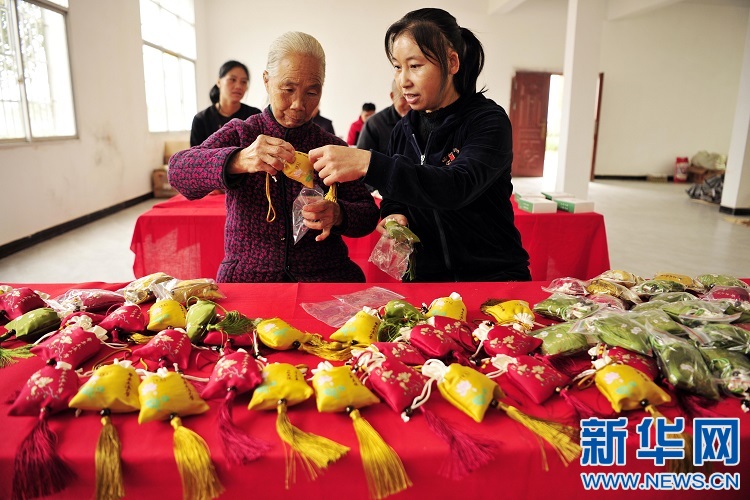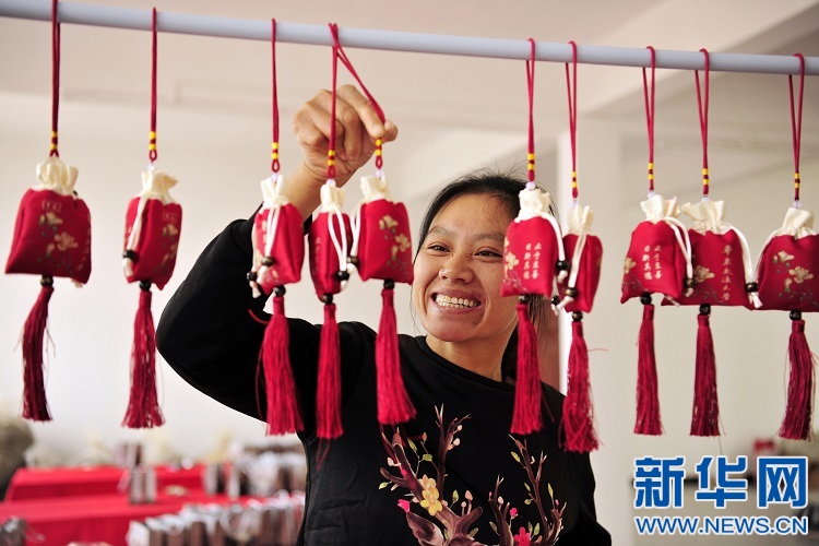 10月19日,在黃茅鎮(zhèn)軍屯村扶貧車間,村民在制作迷迭香袋。新華網發(fā) 鄧龍華 攝