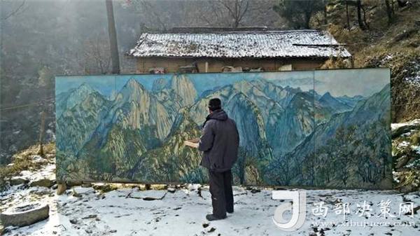 作品《神屏》,始于2013年春季寫生,東仰太華的清晨,主峰巍峨,山谷靜悄悄的,逆光下的高山統(tǒng)一在多層次的藍色調里,復雜的山石結構則需要反反復復耐心的修改塑造,畫長三米九,高兩米。