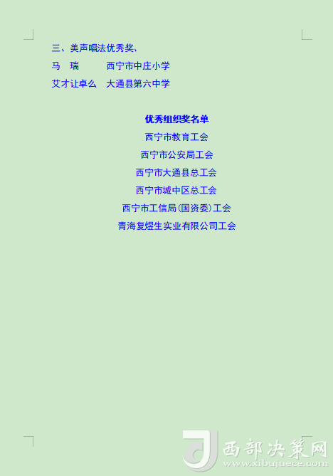 西部決策網(wǎng)訊 11月13日下午,“中國(guó)夢(mèng)•勞動(dòng)美——唱響勞動(dòng)贊歌•建設(shè)幸福西寧”西寧市職工群眾歌手大賽正式落下帷幕,本次比賽由市總工會(huì)、團(tuán)市委、市婦聯(lián)、市文聯(lián)、市殘聯(lián)、市工商聯(lián)、市科協(xié)、市紅十字會(huì)、市廣播電視臺(tái)聯(lián)合主辦,市五一工人文化宮、市職工群眾業(yè)余藝術(shù)團(tuán)承辦,來(lái)自全市各行各業(yè)職工群眾代表300余人參加了頒獎(jiǎng)典禮。同時(shí)頒獎(jiǎng)典禮現(xiàn)場(chǎng)采取直播的方式,獲得13.5萬(wàn)次點(diǎn)擊、4.1萬(wàn)個(gè)點(diǎn)贊。