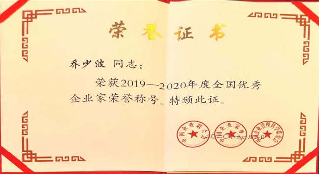 喜訊!神南產(chǎn)業(yè)發(fā)展公司董事長、總經(jīng)理喬少波喜獲2019-2020年度“全國優(yōu)秀企業(yè)家”榮譽(yù)稱號(hào)