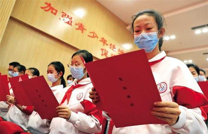 11月30日,陜西省2020年“憲法宣傳周”啟動儀式在西安舉行。全省13個市(區(qū))107個縣(區(qū))統(tǒng)一啟動實施。這是西安高新區(qū)第五小學探花嶺校區(qū)學生正在誦讀憲法。 記者 安濤 攝