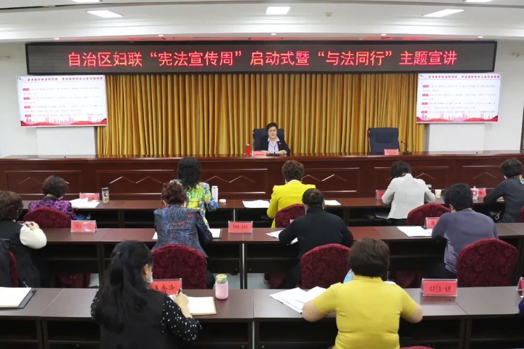 今年12月4日是第七個(gè)國家憲法日,也是我國第三個(gè)“憲法宣傳周”。今年的活動主題為“深入學(xué)習(xí)宣傳習(xí)近平法治思想,大力弘揚(yáng)憲法精神”。為全面貫徹落實(shí)黨的十九屆五中全會精神和第三次中央新疆工作座談會精神,充分發(fā)揮婦聯(lián)組織的優(yōu)勢和作用,推動憲法學(xué)習(xí)宣傳走入日常生活、走入干部群眾,11月30日, 自治區(qū)婦聯(lián)按照自治區(qū)黨委全面依法治疆委員會辦公室要求,舉辦了“憲法宣傳周”啟動式暨“與法同行”主題宣講活動。