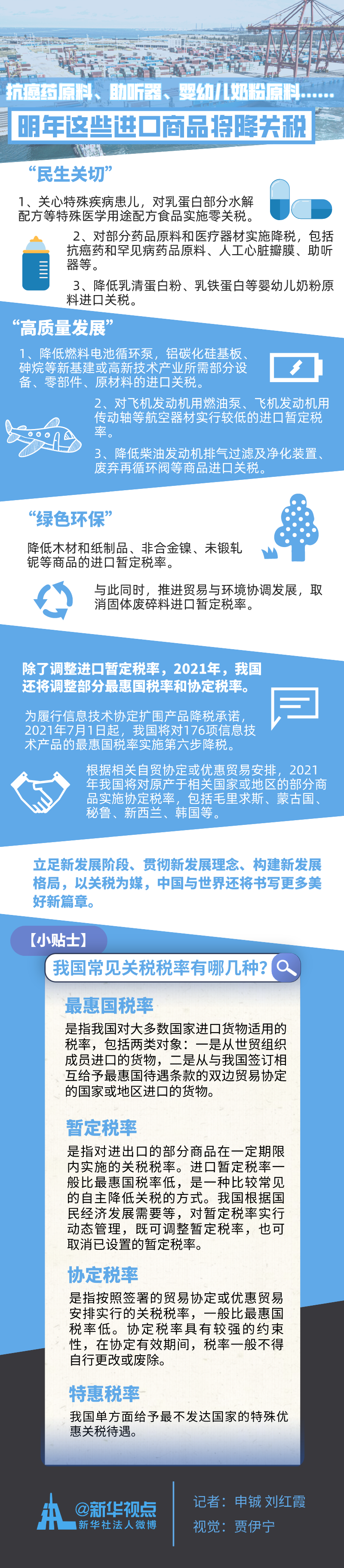 每逢年末,我國(guó)都會(huì)根據(jù)經(jīng)濟(jì)社會(huì)發(fā)展情況對(duì)新一年的部分商品的關(guān)稅稅率進(jìn)行調(diào)整。國(guó)務(wù)院關(guān)稅稅則委員會(huì)23日印發(fā)2021年關(guān)稅調(diào)整方案,決定從明年1月1日開始,對(duì)883項(xiàng)商品實(shí)施低于最惠國(guó)稅率的進(jìn)口暫定稅率,抗癌藥原料、助聽器、嬰幼兒奶粉原料等跟百姓生活密切相關(guān)的商品均在其中。同時(shí),隨著中國(guó)對(duì)外開放持續(xù)擴(kuò)大,部分協(xié)定稅率、最惠國(guó)稅率也將在明年降低。(記者申鋮、劉紅霞)