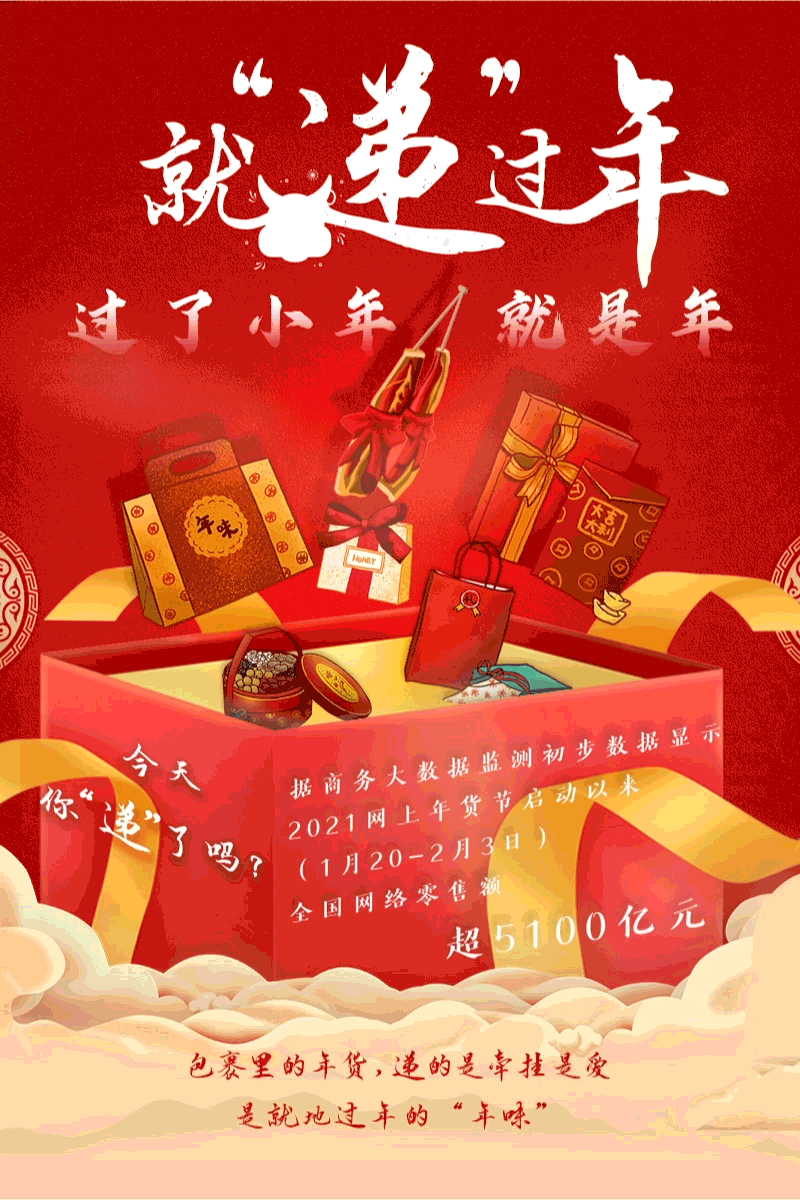 就地過年,年味不減。商務部2月4日發(fā)布數(shù)據(jù),由商務部等部門指導開展的“2021年全國網(wǎng)上年貨節(jié)”,自1月20日啟動以來,全國網(wǎng)絡零售額已超5100億元。“云”購年貨,就“遞”過年,成為人們的新年俗。(記者于佳欣、王雨蕭,設計張晨光)