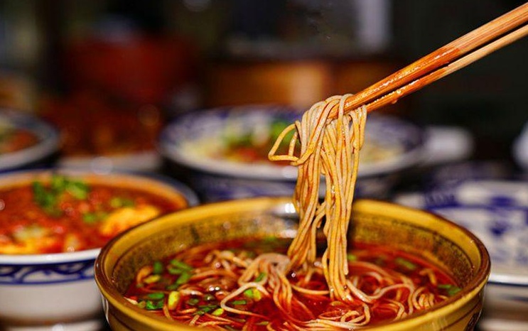 羊肉饸饹又稱蕎面饸饹,是北方面食三絕之一,與蘭州拉面、山西刀削面齊名,制作羊肉饸饹最重要的是羊肉臊子,選上好肥瘦相間的羊肉,切成細丁,小火煸炒,浸出油脂,加入花椒大料,慢火燉制數(shù)小時,又以羊油和食用油燒制成紅油辣子入臊子湯。接著制作饸饹,饸饹以蕎面為主,摻入一定比例的小麥粉,加入蒿子增加韌性,和好的面團通過有漏眼的“床子”壓成面條,直接入沸水煮熟,經(jīng)冷水過涼,淋水入碗回?zé)?,澆上羊肉臊子湯,漂一層辣子紅油,瞬間香味撲鼻,讓人垂涎欲滴。吃的時候滴入香醋,再加上一個芝麻燒餅,肉爛湯香,味道酸辣,光滑筋道,羊肉、饸饹、燒餅的香味交織在一起,在唇齒間彌漫,讓人回味無窮。