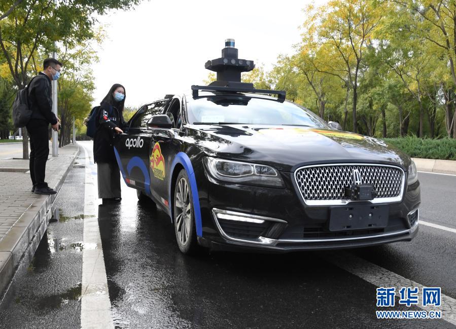 市民在北京市海淀區(qū)稻香湖路的百度自動駕駛出租車指定上車點乘車(2020年10月14日攝)。新華社記者 任超 攝