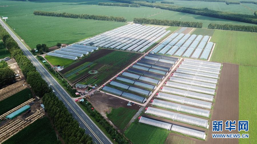 帶動脫貧戶就業(yè)的黑龍江省肇東市黎明鎮(zhèn)甜嫂創(chuàng)意休閑農(nóng)業(yè)園區(qū)全貌(無人機照片,2020年7月6日攝)。新華社記者 王建威 攝
