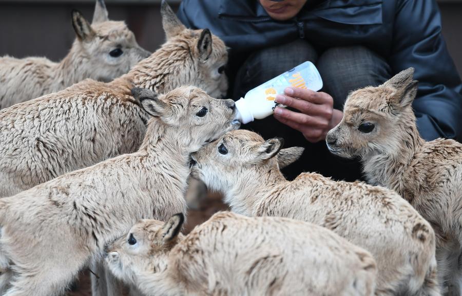 2020年7月7日,三江源國(guó)家公園管理局長(zhǎng)江源園區(qū)可可西里管理處卓乃湖保護(hù)站的工作人員才文多杰在給藏羚羊幼仔喂奶。新華社記者 薛玉斌 攝