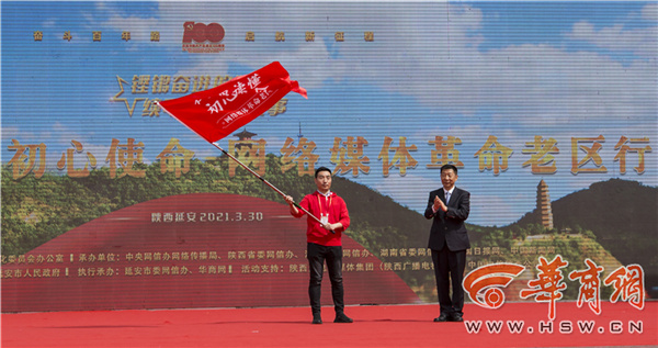 主會(huì)場(chǎng)活動(dòng)結(jié)束后,陜西分會(huì)場(chǎng)“在這里讀懂初心使命——網(wǎng)絡(luò)媒體革命老區(qū)行”網(wǎng)絡(luò)主題采訪活動(dòng)在延安寶塔山游客廣場(chǎng)正式啟動(dòng)。趙剛在分會(huì)場(chǎng)啟動(dòng)儀式上講話并向采訪團(tuán)授旗。陜西省委網(wǎng)信辦主任鮑永能主持啟動(dòng)儀式。中央網(wǎng)信辦網(wǎng)絡(luò)傳播局副局長(zhǎng)邵波濤,陜西省委網(wǎng)信辦副主任王利參加啟動(dòng)儀式。延安市委副書(shū)記、政法委書(shū)記嚴(yán)漢平在啟動(dòng)儀式上致辭。媒體團(tuán)代表中國(guó)新聞網(wǎng)負(fù)責(zé)人吳慶才作表態(tài)發(fā)言。