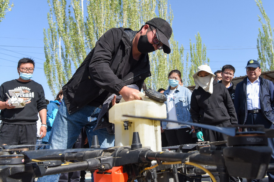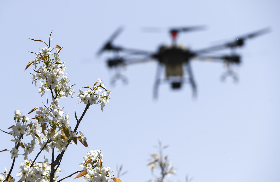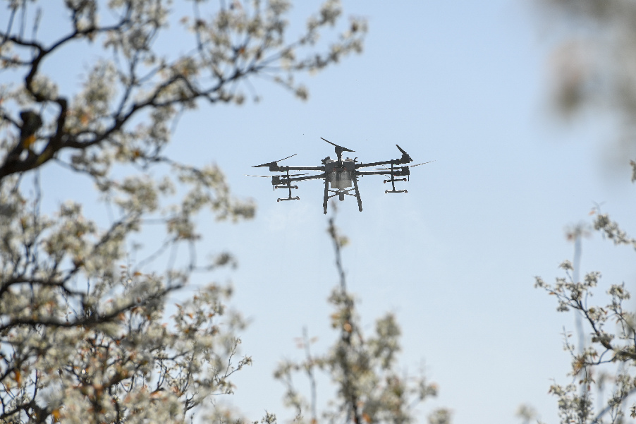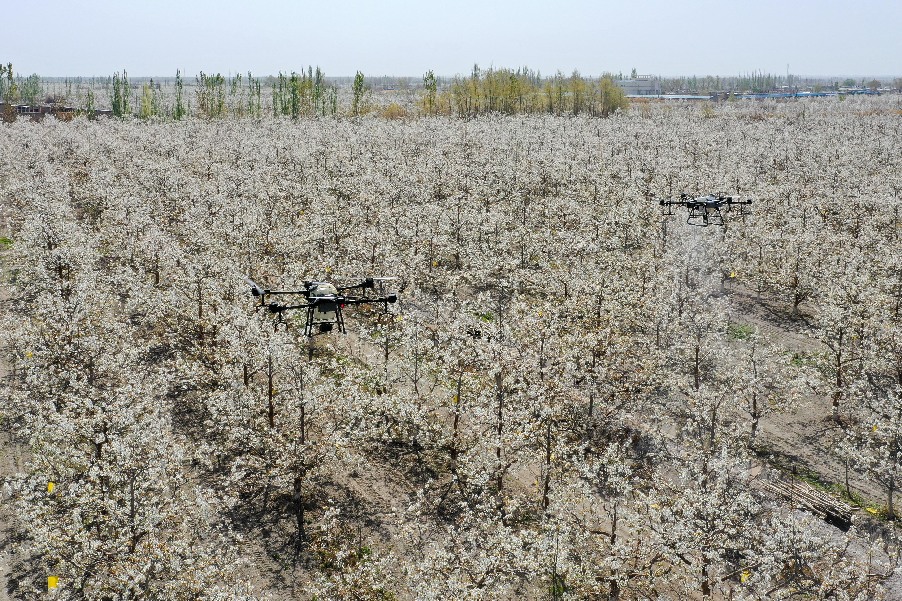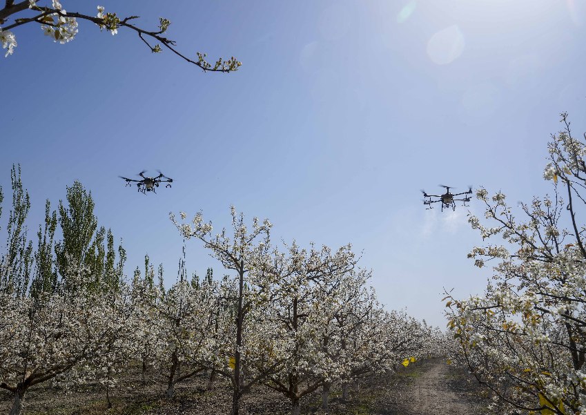 4月11日,在新疆鐵門關(guān)市一處香梨示范園里,無人機(jī)在執(zhí)行高效液體授粉作業(yè)。