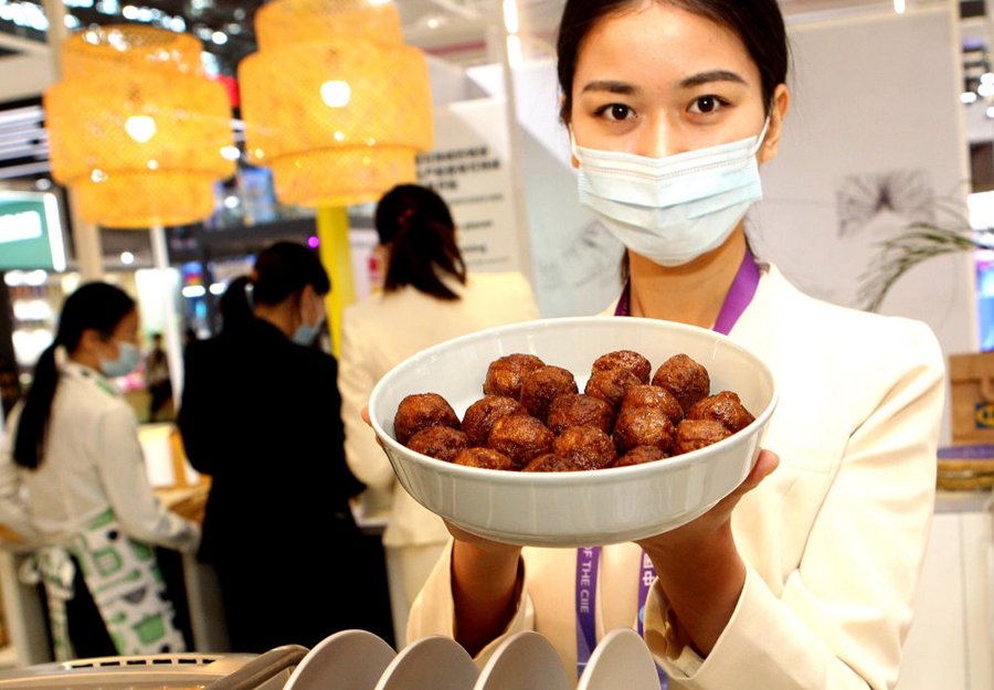 工作人員在第三屆進(jìn)博會展臺展示剛出爐的植物蛋白肉丸。新華社記者 陳飛 攝