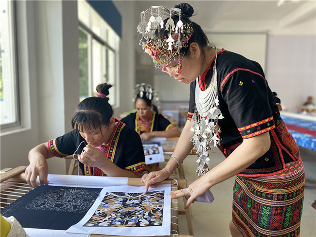 在技藝恢復(fù)的過程中,郭凱的團(tuán)隊(duì)也有意外的收獲。通過對(duì)三聯(lián)幅、五聯(lián)幅龍被的復(fù)制,恢復(fù)傳統(tǒng)龍被織造技藝,對(duì)黎錦傳統(tǒng)技藝的傳承與發(fā)展具有重要意義;通過對(duì)龍被的原材料使用和織造技藝(包括紡染織繡各項(xiàng)技藝)過程編輯形成圖文資料,拍攝形成影像資料,為龍被技藝的保護(hù)、傳承與發(fā)展留下了寶貴的資料和傳播素材;通過開辦龍被刺繡技能培訓(xùn)班,培養(yǎng)了一批刺繡人才,使越來越多的人群能夠掌握傳統(tǒng)特色一技之長(zhǎng),繼而產(chǎn)生富有民族特色的經(jīng)濟(jì)效益和社會(huì)效益,更大程度地傳承民族技藝,并將其發(fā)揚(yáng)光大。