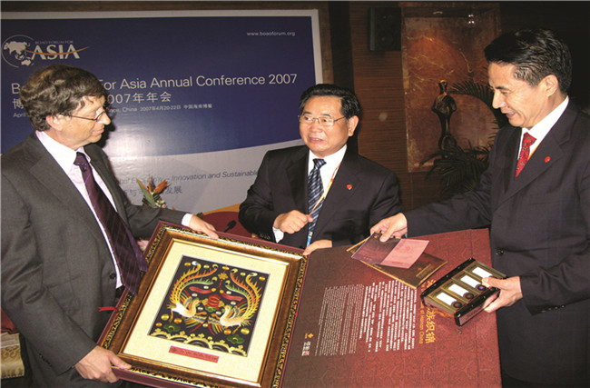 時(shí)任海南省委書記衛(wèi)留成、省長(zhǎng)羅保銘向微軟公司董事長(zhǎng)比爾.蓋茨贈(zèng)送黎錦禮品