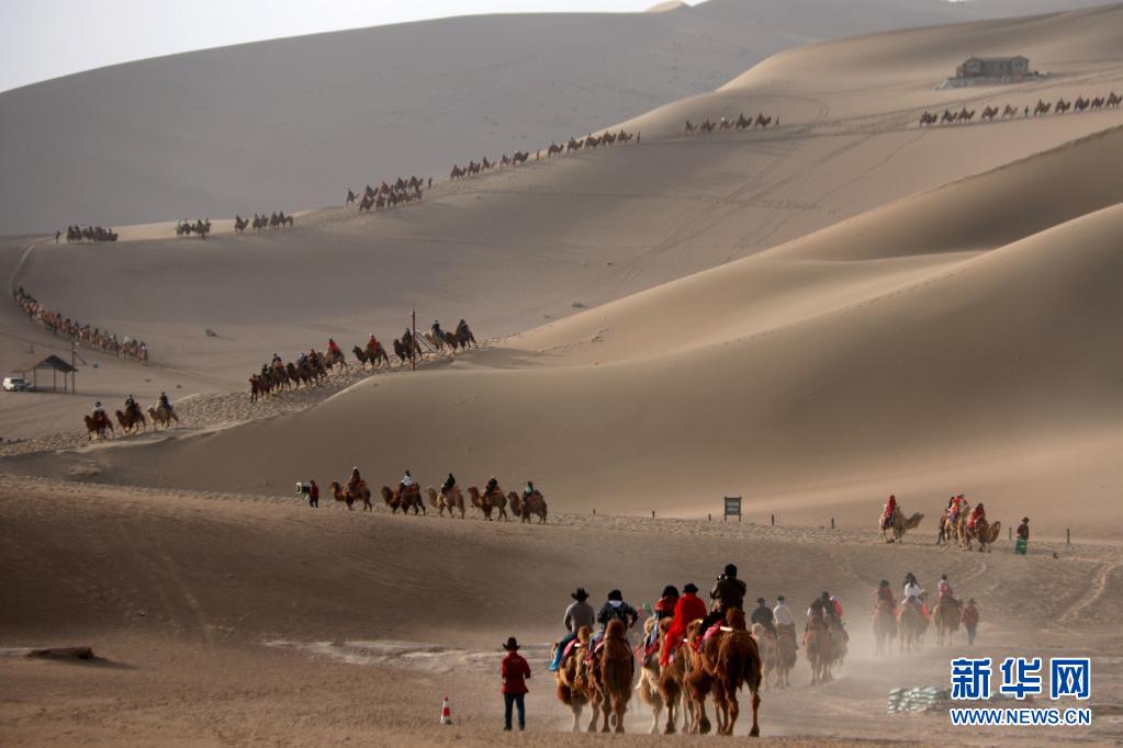 5月1日,游客在甘肅省敦煌市鳴沙山月牙泉景區(qū)游覽。文化和旅游部5月5日晚間公布2021年“五一”假期旅游市場(chǎng)數(shù)據(jù)。統(tǒng)計(jì)顯示,5月1日至5日,全國(guó)國(guó)內(nèi)旅游出游2.3億人次,同比增長(zhǎng)119.7%,按可比口徑恢復(fù)至疫前同期的103.2%。新華社發(fā)(張曉亮 攝)