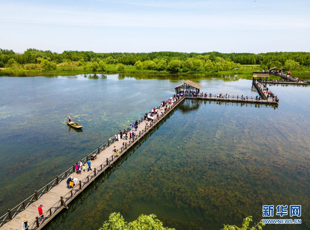 5月2日,游客在江蘇省泰州市姜堰區(qū)溱湖國(guó)家濕地公園棧道上游覽(無人機(jī)照片)。文化和旅游部5月5日晚間公布2021年“五一”假期旅游市場(chǎng)數(shù)據(jù)。統(tǒng)計(jì)顯示,5月1日至5日,全國(guó)國(guó)內(nèi)旅游出游2.3億人次,同比增長(zhǎng)119.7%,按可比口徑恢復(fù)至疫前同期的103.2%。新華社發(fā)(顧繼紅 攝)