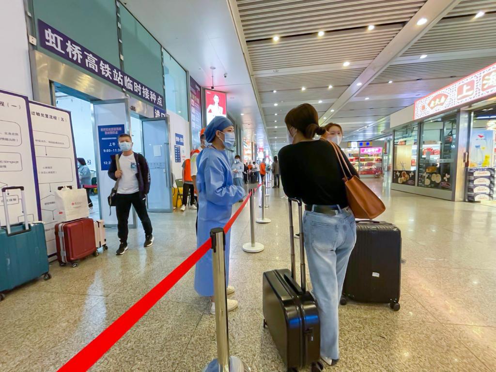 2021年5月29日,上海,旅客在上海虹橋火車(chē)站臨時(shí)疫苗接種點(diǎn)向醫(yī)務(wù)人員咨詢。新華社記者 黃安琪 攝