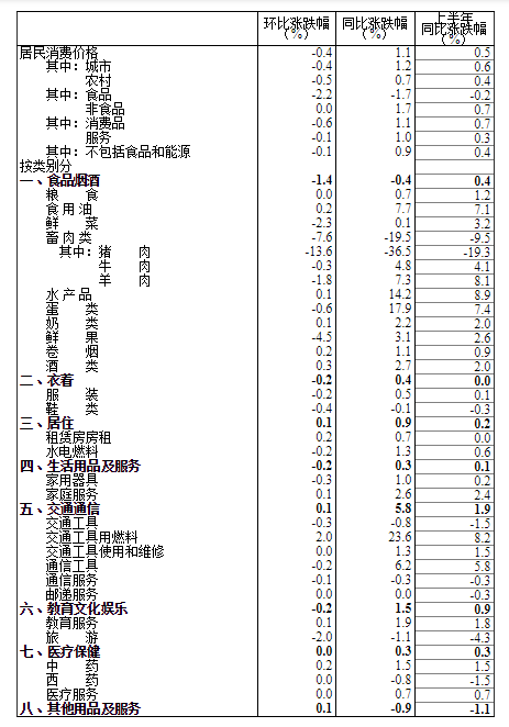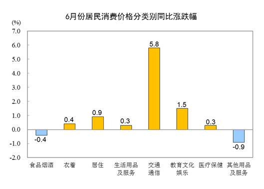 其他七大類價(jià)格同比六漲一降。其中,交通通信、教育文化娛樂、居住價(jià)格分別上漲5.8%、1.5%和0.9%,衣著、生活用品及服務(wù)、醫(yī)療保健價(jià)格分別上漲0.4%、0.3%和0.3%;其他用品及服務(wù)價(jià)格下降0.9%。