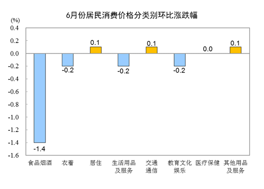 6月份,全國(guó)居民消費(fèi)價(jià)格環(huán)比下降0.4%。其中,城市下降0.4%,農(nóng)村下降0.5%;食品價(jià)格下降2.2%,非食品價(jià)格持平;消費(fèi)品價(jià)格下降0.6%,服務(wù)價(jià)格下降0.1%。