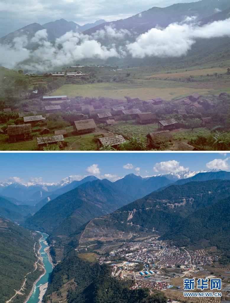 拼版照片:上圖是20世紀80年代的墨脫縣景色(新華社記者才龍攝);下圖是2021年2月13日拍攝的墨脫縣風光(新華社記者孫非攝,無人機照片)。新華社發(fā)