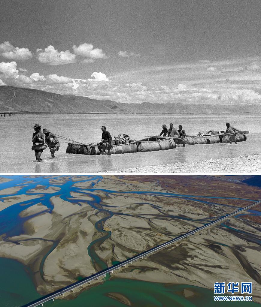 拼版照片:上圖是20世紀50年代,雅魯藏布江上游的牛皮船載著土特產(chǎn)和糧食沿江運輸至西藏東部(新華社發(fā) 趙奇攝);下圖是2016年12月11日拍攝的位于西藏山南市扎囊縣境內(nèi)的扎囊特大橋(新華社記者普布扎西攝)。新華社發(fā)