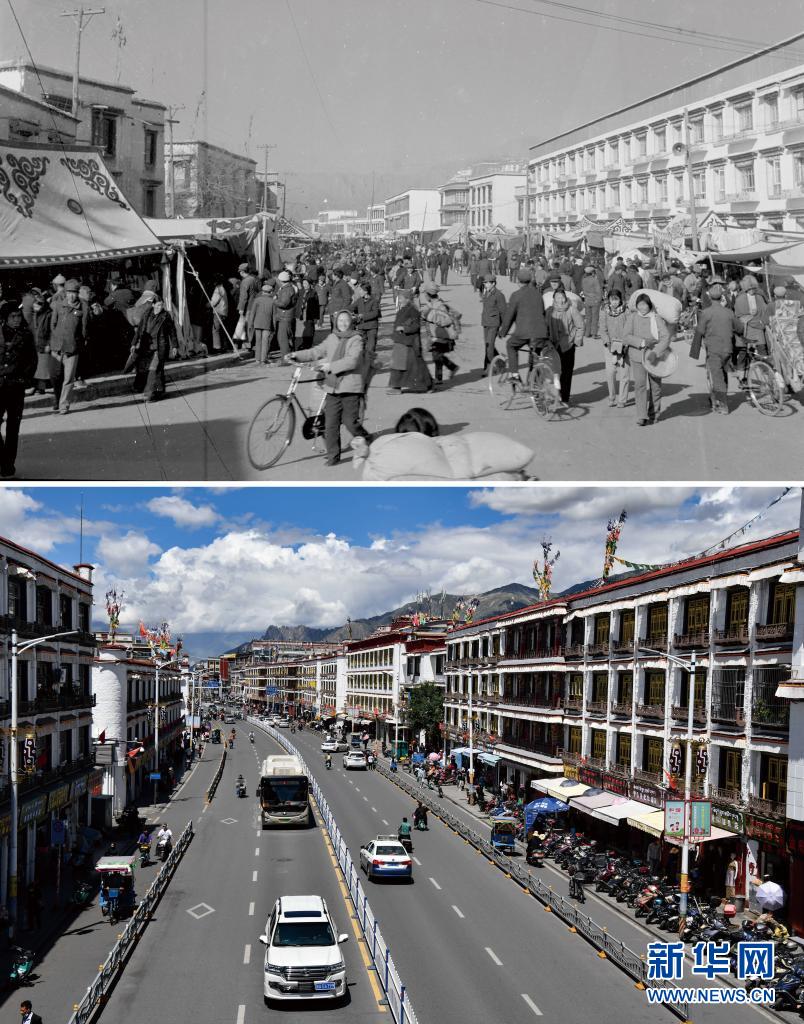 拼版照片:上圖是1959年拍攝的拉薩八廓街(新華社記者王純德攝);下圖是2021年8月13日拍攝的八廓街(新華社記者普布扎西攝)。新華社發(fā)