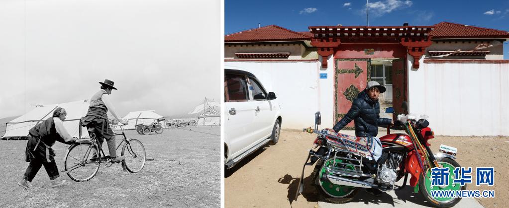 拼版照片:左圖是20世紀80年代,西藏聶榮縣牧民在騎自行車(新華社發(fā) 巴桑攝);右圖是2017年2月23日,那曲市聶榮縣牧民家的孩子在自家門前擺弄摩托車(新華社記者覺果攝)。新華社發(fā)