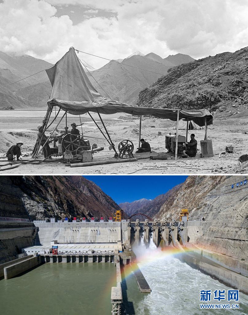 拼版照片:上圖是20世紀50年代,西藏工程勘察隊鉆探組在選定的拉薩水力發(fā)電廠廠址,用從東北雞西礦務局機械總廠運來的鉆探機進行鉆探(新華社記者任用昭攝);下圖是2018年10月26日拍攝的西藏首座大型水電站——藏木水電站(新華社發(fā) 董志雄攝)。新華社發(fā)