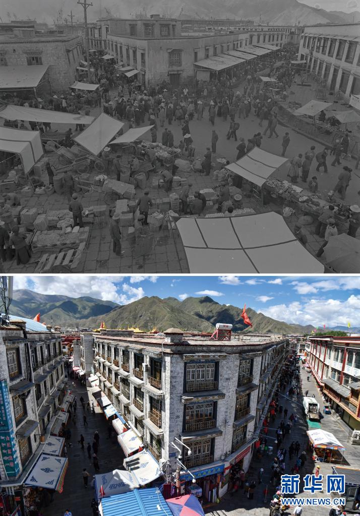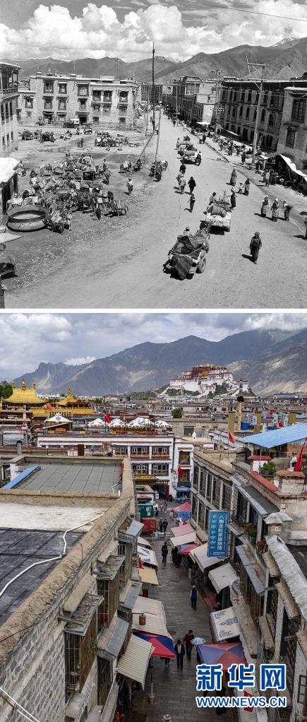 拼版照片:上圖是20世紀50年代的拉薩市八廓街(新華社記者王純德攝);下圖是2021年8月13日拍攝的拉薩市八廓街(新華社記者覺果攝)。新華社發(fā)