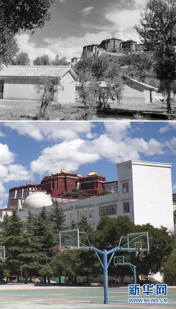 拼版照片:上圖是20世紀50年代拍攝的西藏第一所現(xiàn)代正規(guī)初級中學——拉薩中學一角(新華社記者景家棟攝);下圖是2021年8月9日拍攝的拉薩中學一角(新華社記者孫瑞博攝)。新華社發(fā)