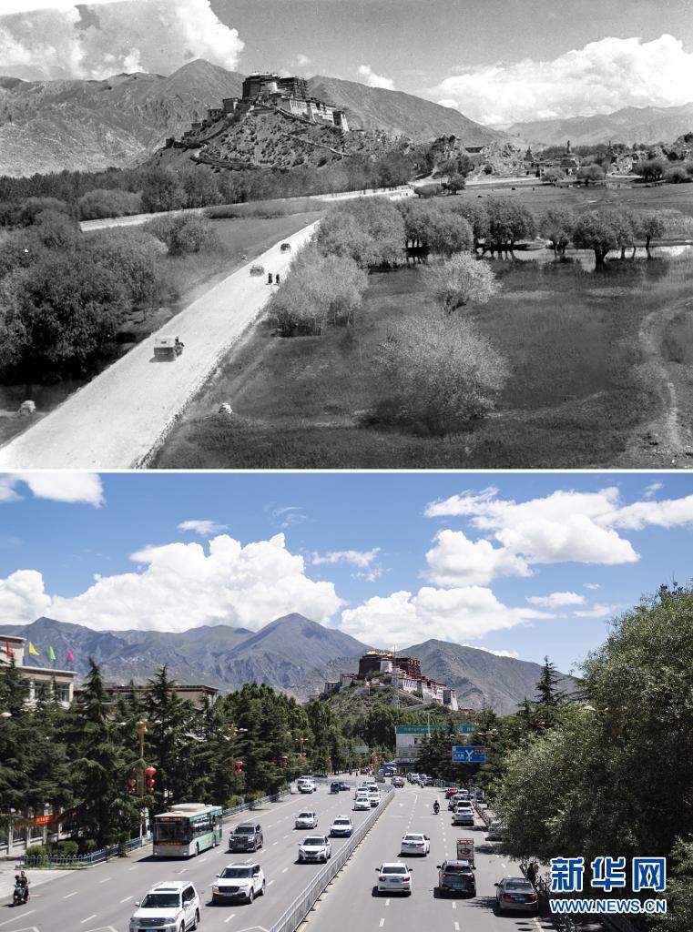 拼版照片:上圖是20世紀50年代,汽車通過市郊公路開往布達拉宮方向(新華社記者任用昭攝);下圖是2021年8月9日,車輛穿行在通往布達拉宮的大路上(新華社記者張汝鋒攝)。新華社發(fā)