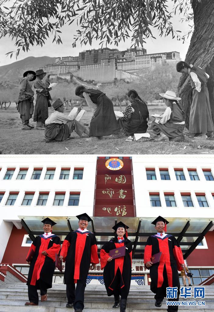 拼版照片:上圖是20世紀50年代,拉薩小學的學生在布達拉宮前練習寫生(新華社記者任用昭攝);下圖是2017年11月10日,西藏本土培養(yǎng)的首批博士研究生畢業(yè)(新華社記者覺果攝)。新華社發(fā)