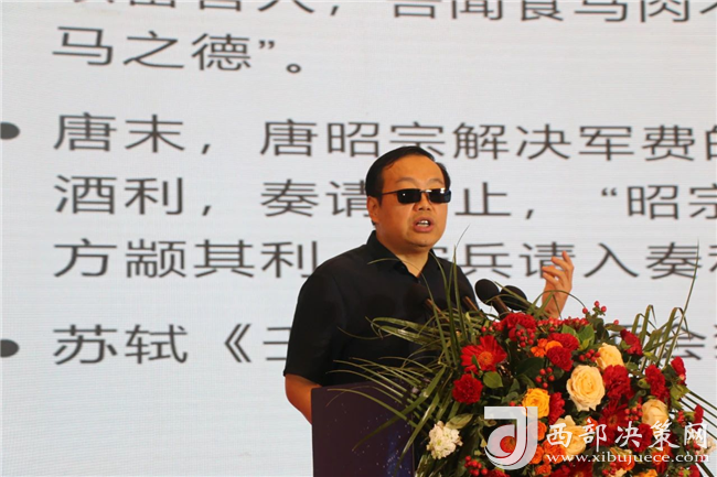 陜西師范大學歷史文化學院教授、博士生導師于賡哲教授以《西鳳高飛——講好中國的酒故事》為題作了酒文化分享。他從穆公賜酒、唐代榷酒、蘇軾詠酒、明清燒坊等方面講述了西鳳酒悠久的歷史文化,同時對西鳳酒的發(fā)展提出了思考,他講到白酒行業(yè)的營銷要重視文化底蘊、緊抓年輕一代消費者的品味,號召大家要弘揚好西鳳酒,講好中國酒故事。