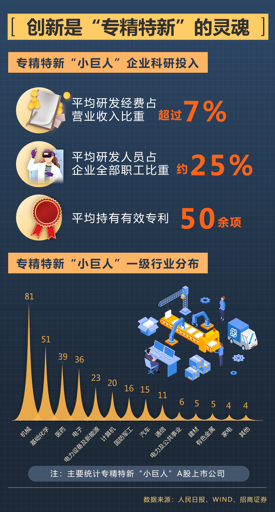 “小巨人”企業(yè)在多個(gè)關(guān)鍵領(lǐng)域?yàn)辇堫^骨干企業(yè)配套,也在細(xì)分領(lǐng)域持續(xù)創(chuàng)新并占據(jù)市場(chǎng)領(lǐng)先地位。這些企業(yè)注重制造業(yè)細(xì)分領(lǐng)域的創(chuàng)新,在上天、入海、探月、高鐵等大國工程中,都能找到“小巨人”企業(yè)的產(chǎn)品。根據(jù)招商證券統(tǒng)計(jì),A股上市的專精特新“小巨人”企業(yè)中,機(jī)械行業(yè)的占比最高,基礎(chǔ)化工、醫(yī)藥、電子等緊隨其后。