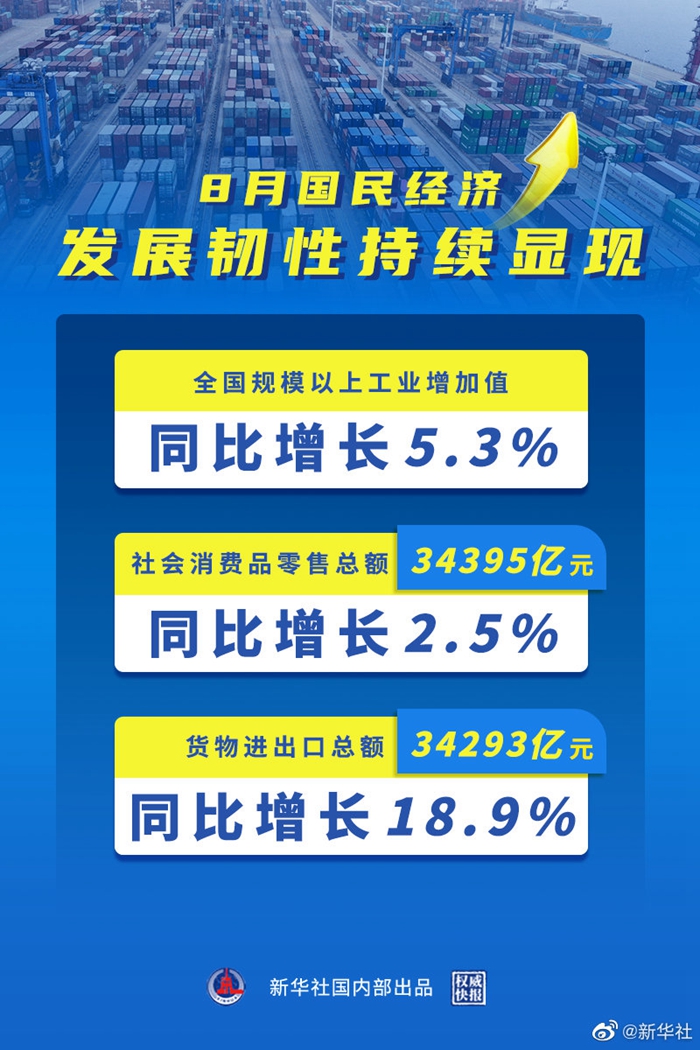國家統(tǒng)計(jì)局15日發(fā)布的數(shù)據(jù)顯示,8月份,全國規(guī)模以上工業(yè)增加值同比增長(zhǎng)5.3%,兩年平均增長(zhǎng)5.4%;社會(huì)消費(fèi)品零售總額34395億元,同比增長(zhǎng)2.5%,兩年平均增長(zhǎng)1.5%;貨物進(jìn)出口總額34293億元,同比增長(zhǎng)18.9%,國民經(jīng)濟(jì)發(fā)展韌性持續(xù)顯現(xiàn)。(記者魏玉坤、謝?,帲?/p>