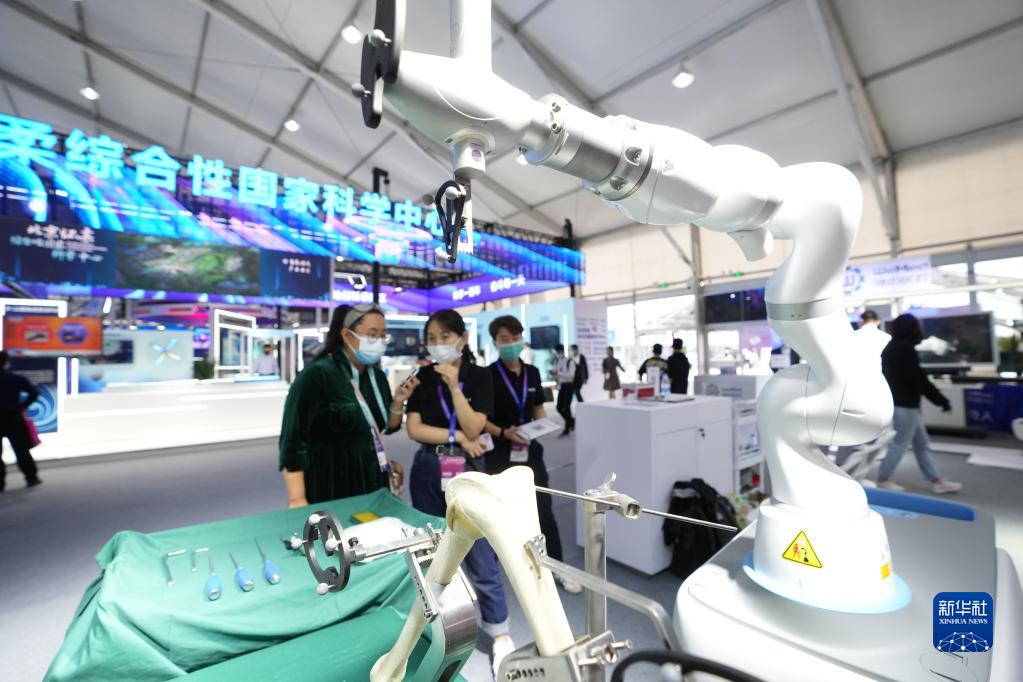參觀者在2021中關(guān)村論壇展覽(科博會)參觀展出的一款適用于全膝關(guān)節(jié)置換手術(shù)的機器人。(9月25日攝)。新華社記者 鞠煥宗 攝
