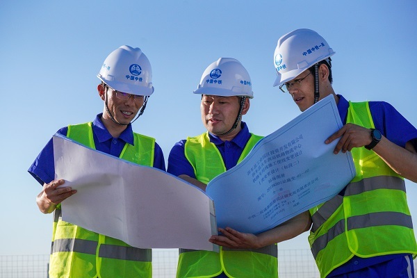 馮兵與同事現(xiàn)場研究圖紙,討論施工方案