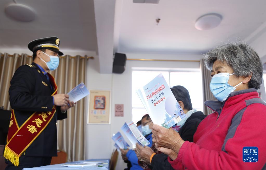 12月4日,在河北省邢臺(tái)市襄都區(qū)東郭村鎮(zhèn)南康莊村,普法志愿者在給村民進(jìn)行普法宣傳。新華社發(fā)(張馳 攝)