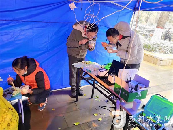 正當(dāng)隊(duì)員們準(zhǔn)備修整一天時(shí),新的命令到了,要求醫(yī)療隊(duì)安排300名隊(duì)員支援雁塔區(qū)核酸采集工作,大家毫無(wú)怨言,坐上了趕赴雁塔區(qū)的大巴。這是最不尋常的一天,醫(yī)療隊(duì)承擔(dān)了雁塔區(qū)近10個(gè)居民區(qū)的核酸采樣任務(wù),且大部分都屬于封控區(qū)。核算采樣需上門(mén)采集,風(fēng)險(xiǎn)大、難度高,因?yàn)樾畔⒉杉O(shè)備無(wú)法上樓,只能依靠人工信息錄入,隊(duì)員們身穿防護(hù)服,在操作極其困難的情況下做到了不漏一戶,不落一人。采集結(jié)束已是25日凌晨1點(diǎn),來(lái)自漢臺(tái)區(qū)的余晗和趙凌最后的采集任務(wù)已是凌晨2點(diǎn),此時(shí)的千年古都正飄落著冬日的雪花。這次入戶采集共完成49081人次。