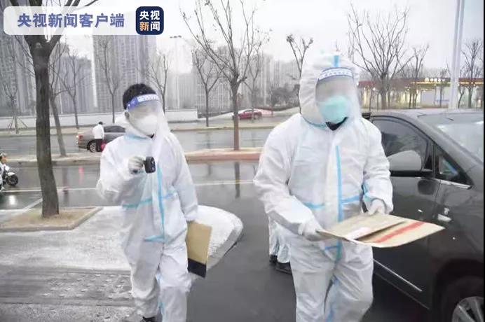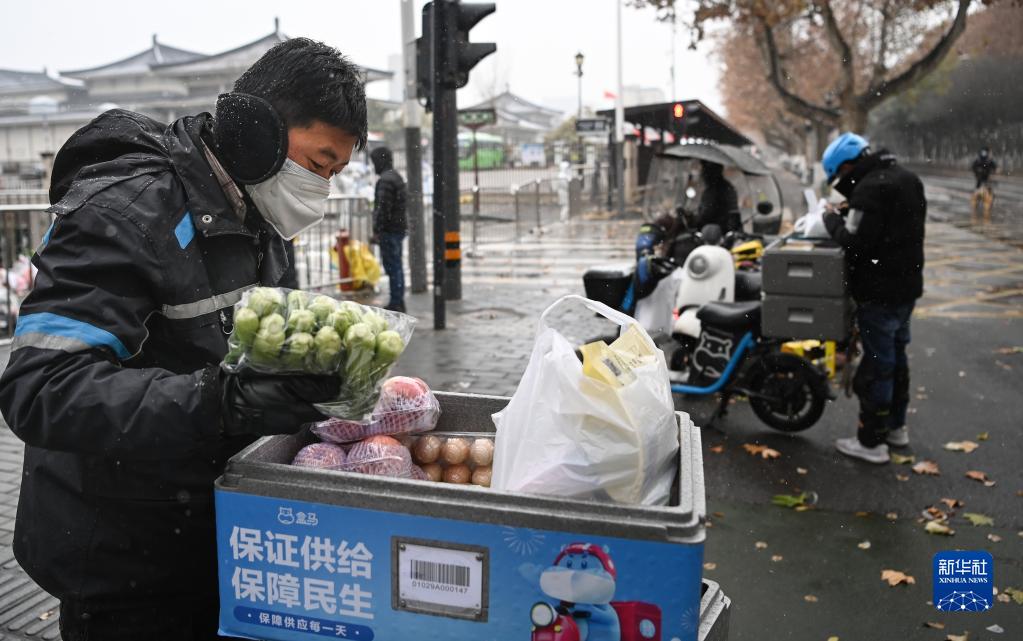 12月25日,外賣人員張欣(左一)在西安市小寨東路一封控小區(qū)配送蔬菜。這幾天,他的業(yè)務(wù)量是平時(shí)的兩倍。新華社記者 陶明 攝
