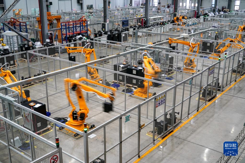 在位于江蘇省南京市江寧區(qū)的南京埃斯頓自動(dòng)化股份有限公司工業(yè)機(jī)器人生產(chǎn)車間,工業(yè)機(jī)器人在進(jìn)行跑合測(cè)試(7月1日攝)。新華社記者 李博 攝