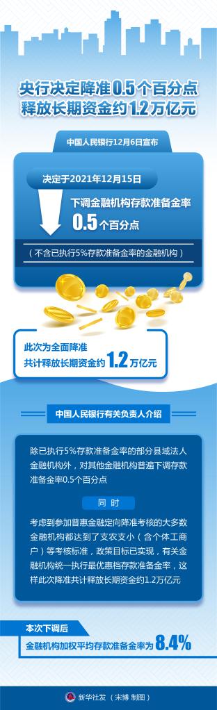 中國(guó)人民銀行12月6日宣布,決定于2021年12月15日下調(diào)金融機(jī)構(gòu)存款準(zhǔn)備金率0.5個(gè)百分點(diǎn)(不含已執(zhí)行5%存款準(zhǔn)備金率的金融機(jī)構(gòu))。此次為全面降準(zhǔn),共計(jì)釋放長(zhǎng)期資金約1.2萬(wàn)億元。新華社發(fā) 宋博 制圖