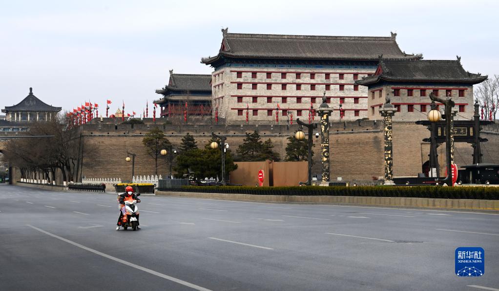 12月28日,一名快遞員行駛在西安市永寧門外的盤道上。新華社記者 陶明 攝